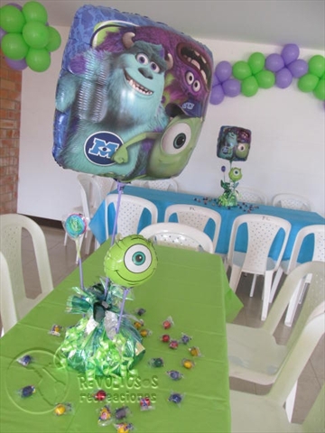 Por ser una fiesta tematica de Monster Inc, todos los accesorios y color de los globos son acordes al tema.